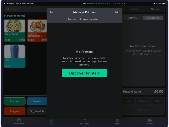 Open your Dines app and head to the EPOS tab (where you would normally view your menu). From here, tap Functions (⚙) at the top of the page, and navigate to Printers > Manage Local Printers.