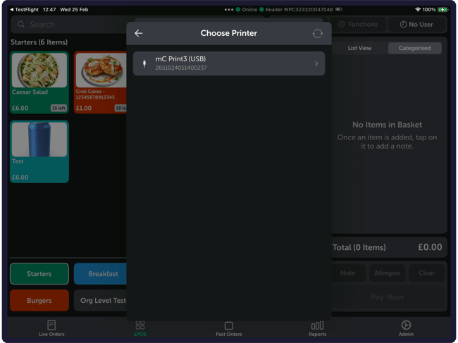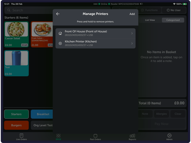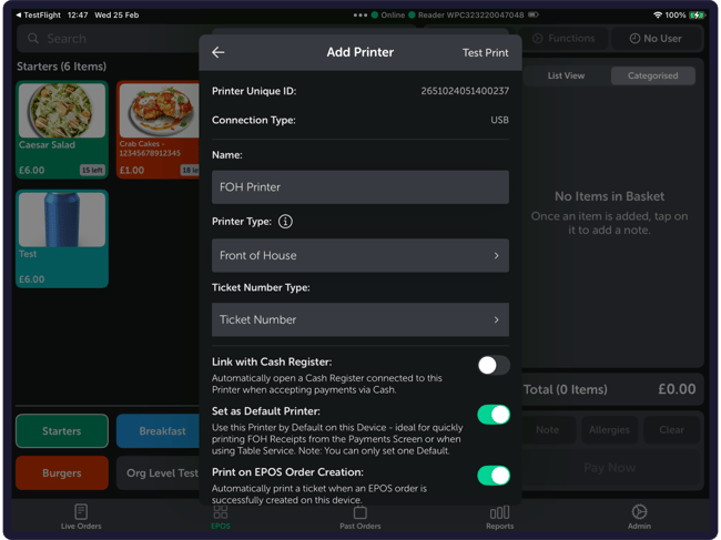 You’ll first be asked to give the printer a name. This can be anything you like, but it’s best to choose something clear and recognisable. For example, “Front of House,” “Bar Printer,” “Kitchen Printer” etc. This is especially important if you plan to have the printer set up more than once on this device, for customer receipts and kitchen tickets (more on that later).