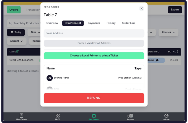 Here, you’ll see a list of the orders taken on your account. Simply find the correct order (remembering you can also use the filters at the top to sort by date, time, etc), tap on the order, and head to the “Print/Receipt” tab.