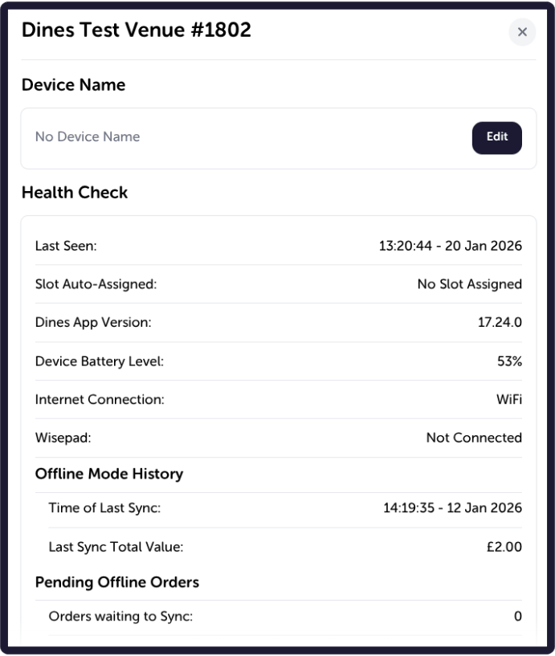 Dines App Version: The version of the Dines For Venues App currently installed on the device.