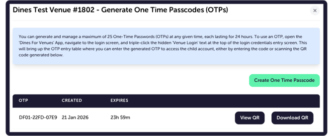 To use a One-Time Passcode, click “Create One-Time Passcode” next to the account you wish to access. This will then generate a 12-digit OTP code, as below. You can either copy this code to your clipboard, or view a QR code for speedy login.