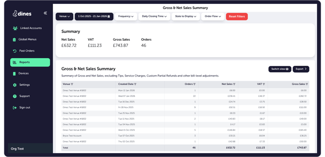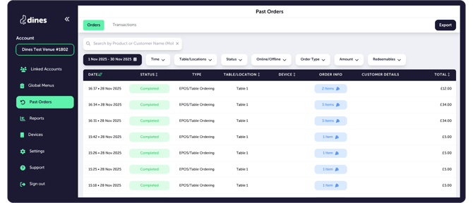 The key difference is that on the Organisation Dashboard, you can choose which linked account’s Past Orders to view. This is done via the account selector at the top-left (on the screenshot above showing as “Dines Test Venue #1802”). When you click there, you can easily switch between accounts.