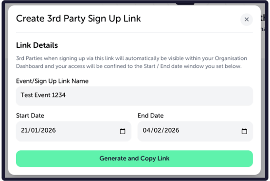In Settings, you can create 3rd Party sign-up links. 3rd Party sign-up links allow new accounts to be created and automatically linked to your Organisation Dashboard.